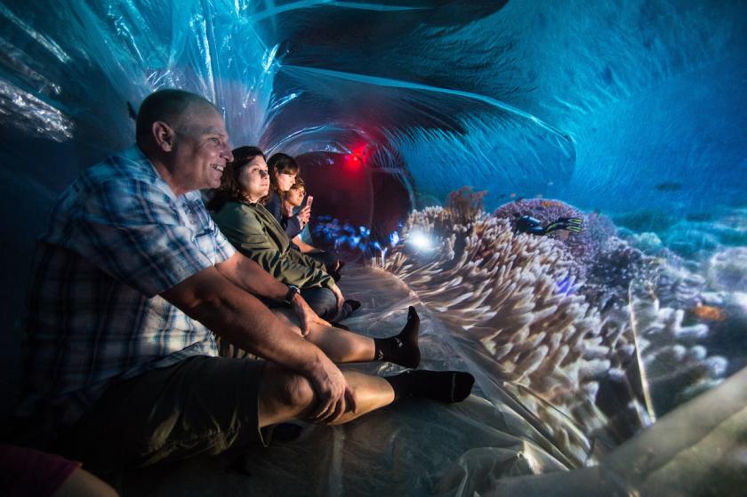 Audience inside projection mapped inflatable structure.
