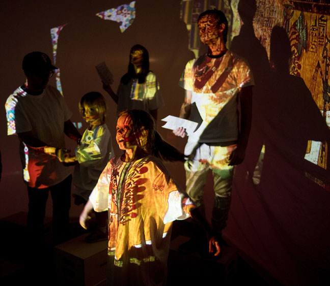 Audience member's movements trigger projections of artwork on their bodies.