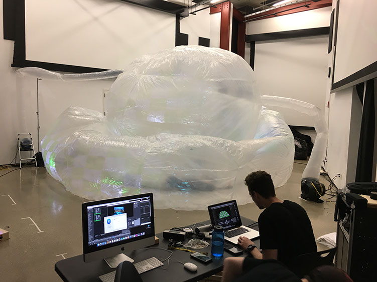 Student built inflatable structure for immersive final project. Student works to projection map the structure using Isadora.