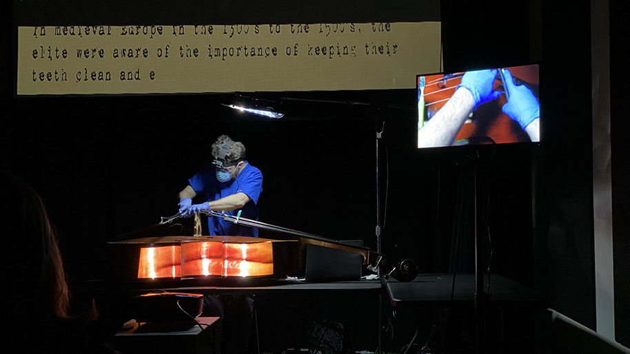 Performance, where bass player has a live-feed video camera mounted to his head.