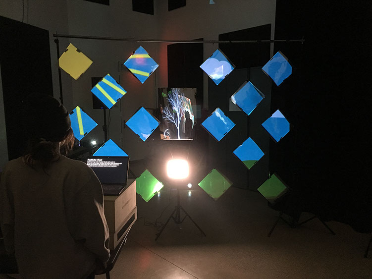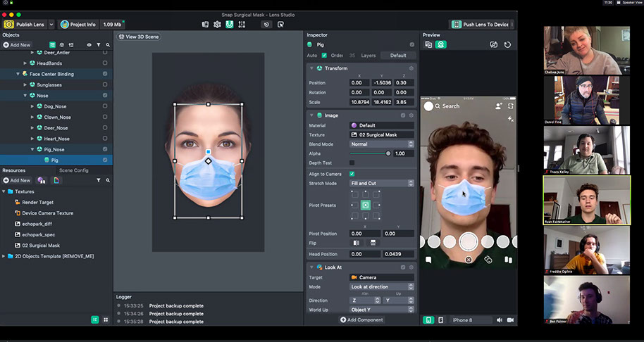 Student showing final project in Augmented Reality using Lens Studio for Snapchat over Zoom. Spring 2020.
