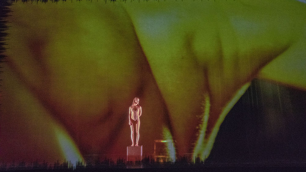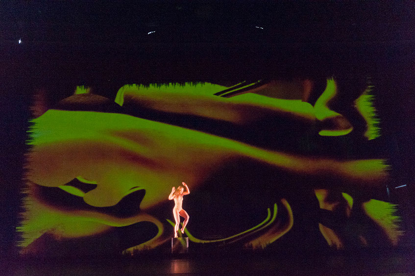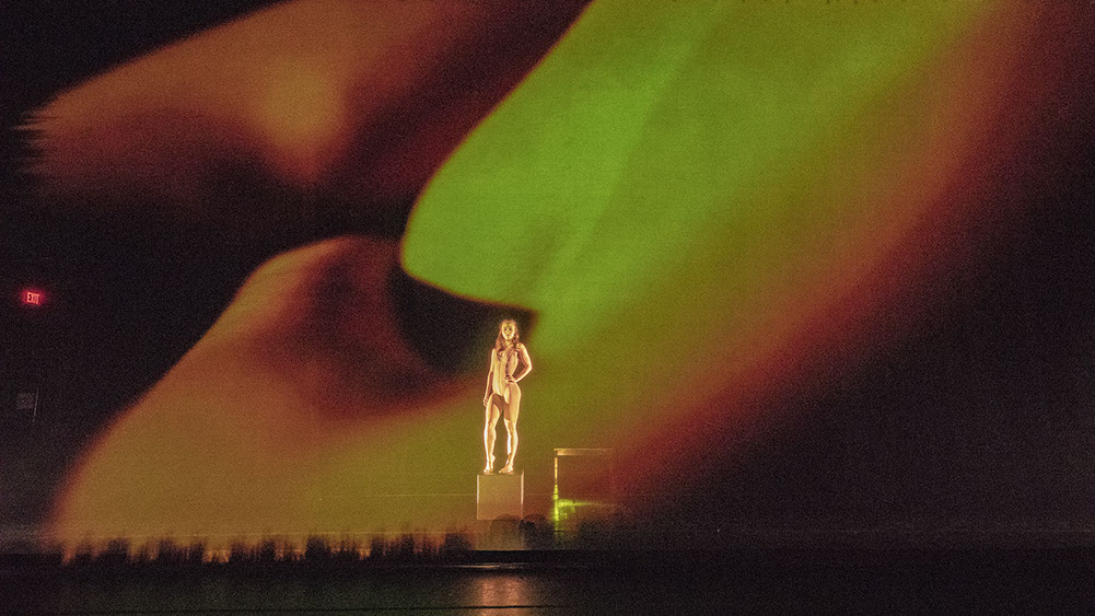 For the second section, Ari posed on another pedestal while images of her naked body were projected onto a scrim. For these photos, we hired a female photographer, Dana Keeton. Ari chose all the photos and edited them for final inclusion in the performance. As this section was specifically about examining the male gaze and Ari being a passive object of desire, I created an Isadora patch that let me, as the media operator/VJ, randomly pick different photos every night. Ari never knew the order of each photo or the duration of how long each one would last (except the first and last photo in the sequence). While unbeknownst to the audience, it was important to Ari’s process that as a male I was controlling this sequence, even though she ultimately was the one in control since she approved all the images and co-created the idea.