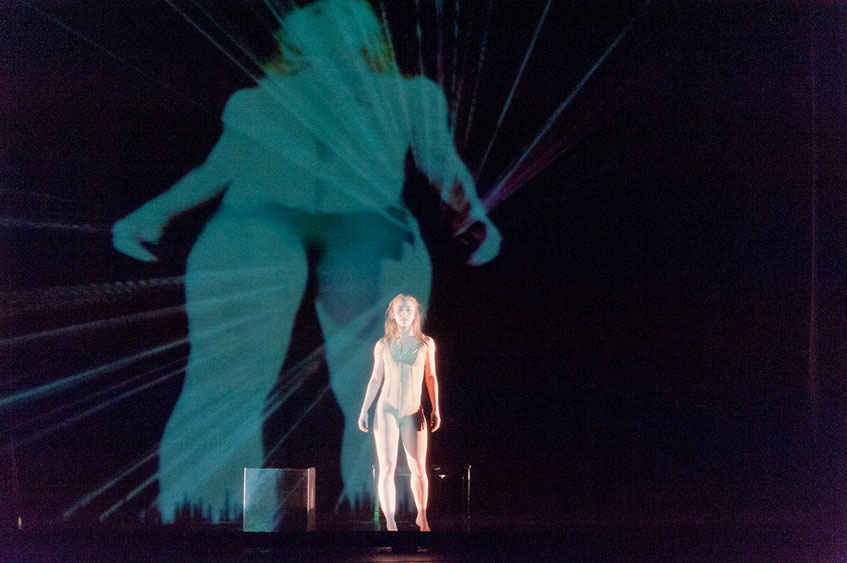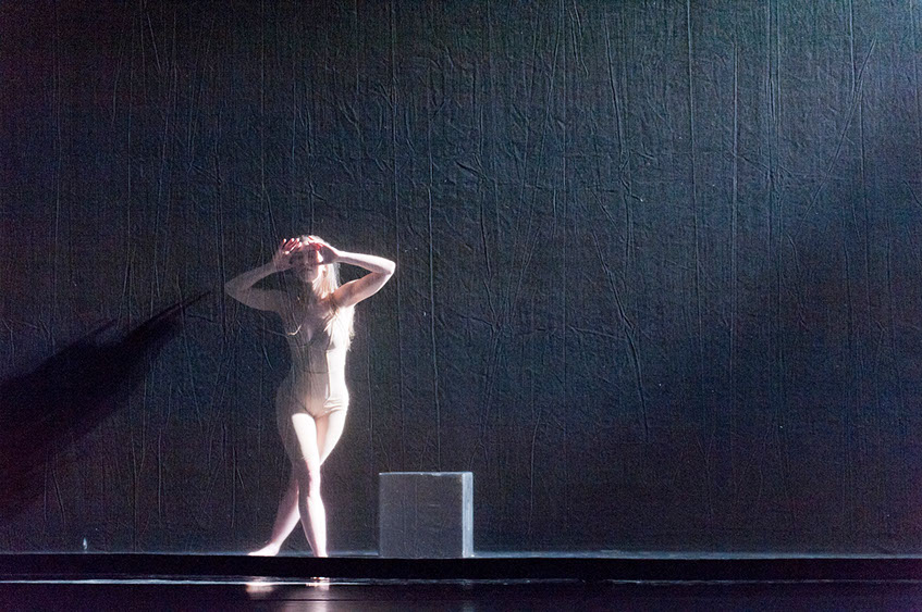 For the beginning of the third section, I created an Isadora patch and live manipulated the RGB feed the Kinect camera of Ari in realtime. I also used the depth sensor of the Kinect camera to motion track Ari’s vertical and horizontal movements in space to give her dynamic control of the visuals. I controlled the mix of these two video feeds and each performance was slightly different. As this section progressed, the video feed that Ari controlled with the motion of her now liberated body took over, until finally she removes the projection scrim and steps out from mediated views of her body.